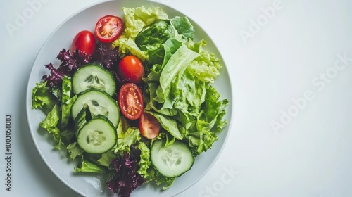 A fresh salad with cucumbers, cherry tomatoes, and mixed greens on a white plate.