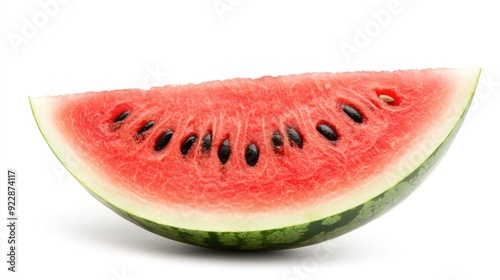 A fresh slice of watermelon with black seeds, isolated on white background.