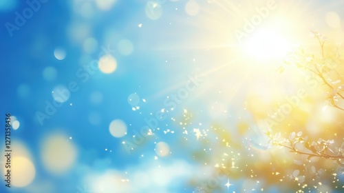 A fresh spring blue sunny sky background with blurred warm sunny glow.