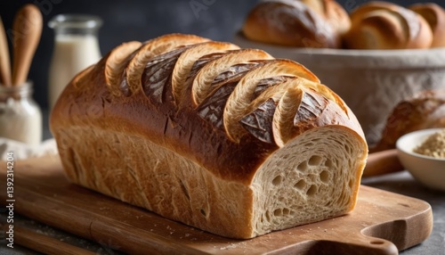 A freshly baked loaf of bread sliced to reveal its soft interior, highlighting the simplicity and comfort of homemade baking.