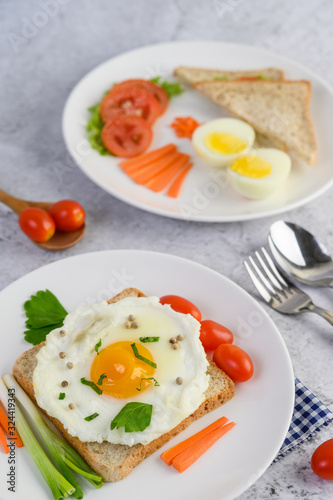 A fried egg laying on a toast, topped with pepper seeds with carrots, baby corn and spring onions.