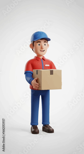 A friendly 3D cartoon delivery man wearing a blue cap and red uniform, holding a brown cardboard package, standing against a plain background.