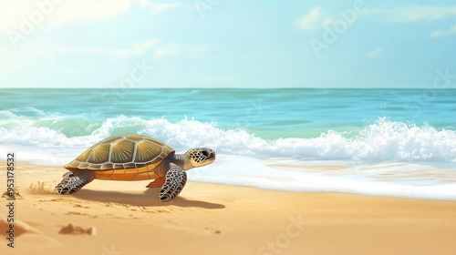 A friendly cartoon turtle slowly walking along a sandy beach, with the ocean waves gently rolling in.