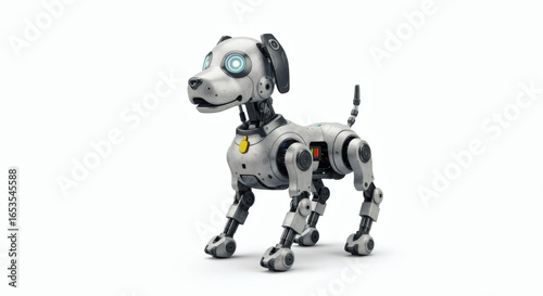 A friendly cybernetic puppy standing isolated on a white background. This AI-powered robotic pet represents future technology and companionship.
