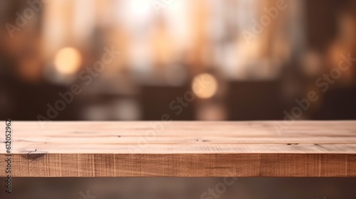 a front view of a dark brown, empty wooden table with a blurry background, serving as a blank wood table mockup, Ai generative