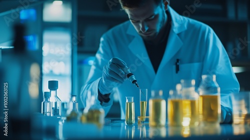 A front view of a doctor conducting a pH test in a research laboratory, with multiple water samples and testing tools
