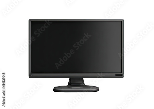 A front view of a flat-screen monitor, dark gray, with a black screen