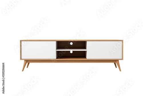 A front view of a light wood tv stand with white doors and shelves on a studio shot on transparent background png