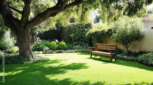 A front yard with a lush garden and wooden bench, shaded by a large tree. The yard is empty, peaceful, and well-maintained