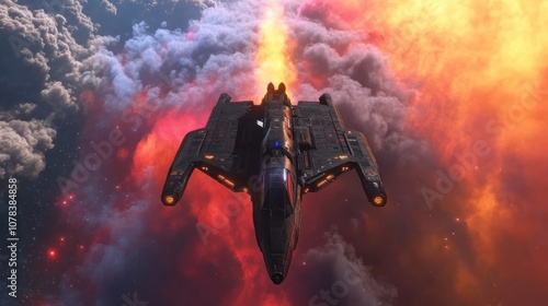 A frontal view of a spaceship passing through a colorful gas cloud in space.