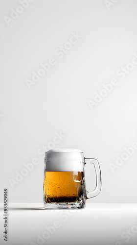 A frosty beer mug filled with golden beer and a thick frothy head stands against a minimalistic gray background