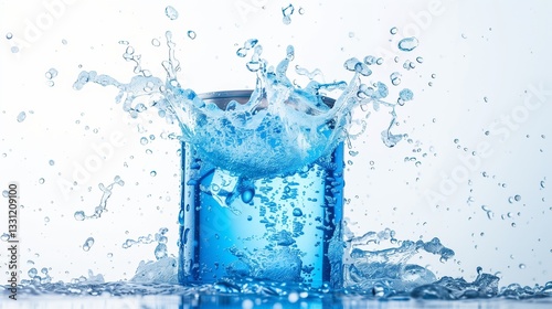 A frozen energy drink splash with vivid blue liquid bursting from a can, with suspended droplets, isolated on white.