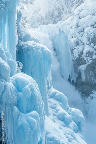 A frozen waterfall suspended in time, intricate ice formations glistening, wide panoramic format