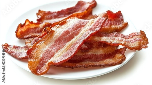 A frying pan filled with sizzling bacon on a clean white background, capturing the delicious moment as the strips crisp up, evoking the mouthwatering aroma of breakfast cooking.