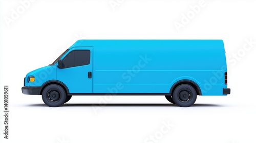 A full side profile of a blue, unmarked, modern Delivery van, delivery truck, business van