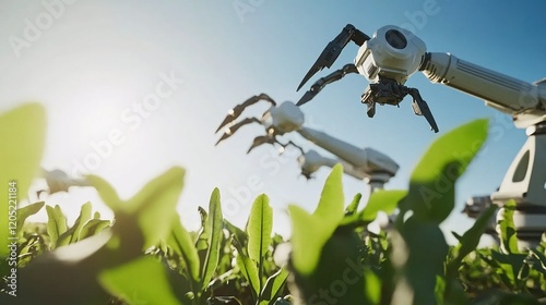 A fully automated farming system with robotic arms harvesting crops under a clear blue sky.