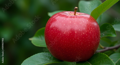 A fully developed apple accompanied by a leafy background.