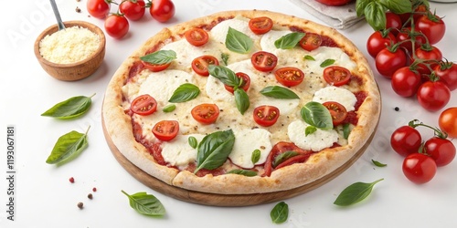 A fully loaded pizza with various toppings including white cheese tomatoes and basil leaves arranged neatly, pizza toppings, tomatoes, food arrangement