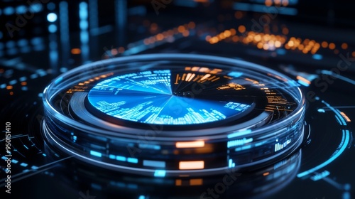 A futuristic 3D pie chart made of glass-like materials, with each segment illuminated, floating in a dark room, representing advanced data visualization techniques.