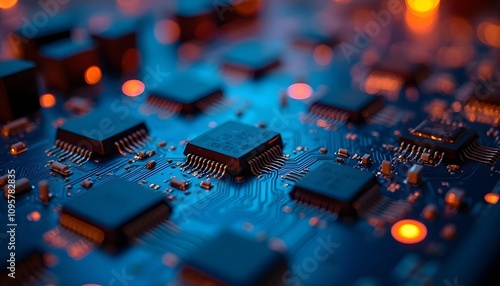 A futuristic abstract circuit board with glowing blue and white geometric patterns