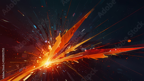 A futuristic abstract design featuring a cracked dimension splitting a metallic surface, revealing a vibrant underlayer of pulsing red and orange energy, with sparks and geometric patterns emanating o