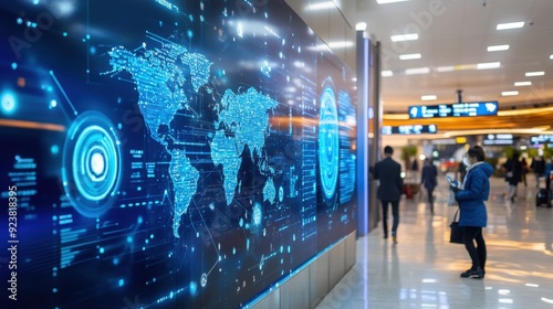 A futuristic airport terminal dedicated to exporting eco-friendly products, with digital panels showcasing global routes.