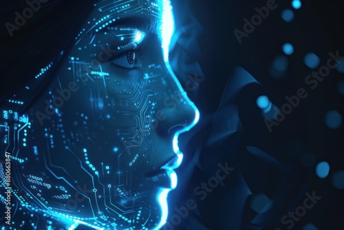 A futuristic and captivating blue glowing image of a human face integrated with digital circuitry, technology concept