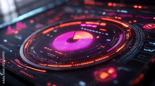 A futuristic animated engagement report, comparing social media platforms with glowing pie charts, interactive data nodes, sleek neon-infused business dashboard, cyber-tech volumetric glow,