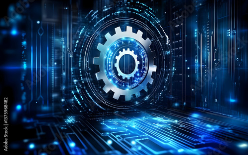 A futuristic blue gear surrounded by digital lines, representing advanced technology and innovation in a high-tech world.