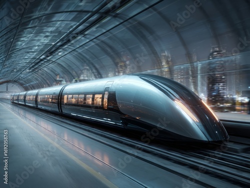A futuristic bullet train speeds through a sleek tunnel, symbolizing the future of transport and high-speed travel.