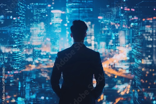 A futuristic businessman envisions the future, where a blockchain-powered ecosystem fosters decentralization, security, and trust. Smart contracts automate transactions,