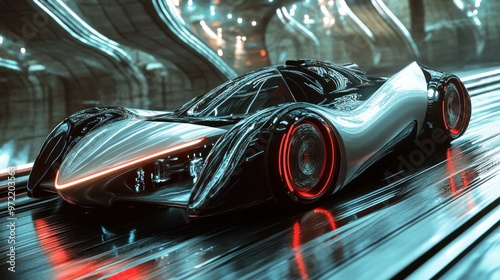 A futuristic car design with sleek lines and glowing accents in a high-tech environment.
