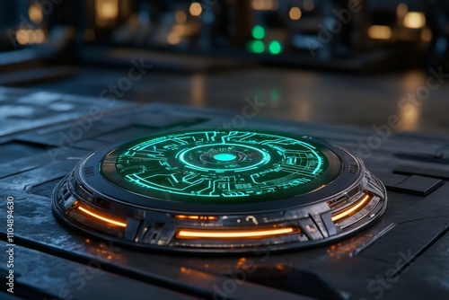 A futuristic CD emitting holographic projections of data, glowing with neon blue and green patterns on its surface