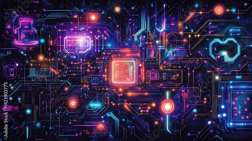 a futuristic circuit board, displaying advanced pathways, neon circuits, and holographic elements