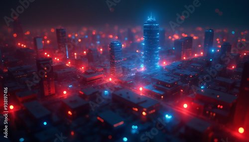 A futuristic city aglow with red and blue lights, resembling a neon dreamscape from the future, capturing the essence of urban innovation.