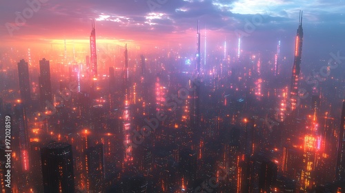 A futuristic city seen from above, glowing with pulsing lights from communication hubs as data flows through the network. The skyline pulses with digital energy,