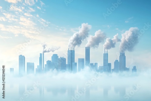 A futuristic city skyline covered in thick PM 2.5 smog, low visibility
