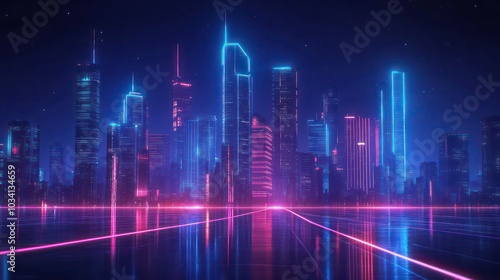 A futuristic city skyline with glowing neon lights and a reflective road in the foreground.