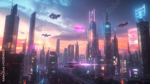 A futuristic city skyline with towering skyscrapers, glowing holograms, and flying vehicles under a neon-lit sky, cyberpunk atmosphere wallpaper AI generated image