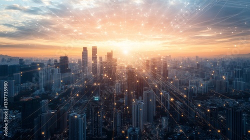 A futuristic city where buildings and technology are seamlessly integrated, creating a smart and connected environment.