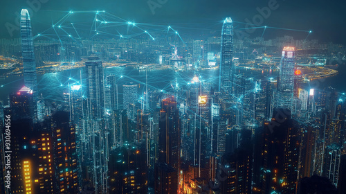 A futuristic cityscape at night, illuminated by neon lights and connected by a network of glowing lines.