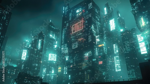 A futuristic cityscape at night, with a towering building displaying a holographic projection of a complex business graph.