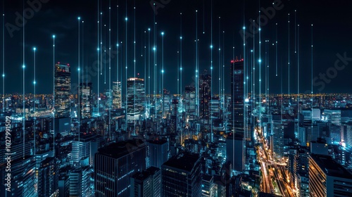A futuristic cityscape at night with glowing lines connecting buildings, symbolizing the interconnectedness of technology and urban life.
