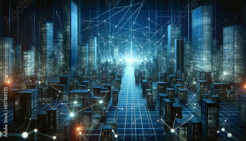 a futuristic cityscape illuminated by blue lights and interconnected by a web of digital lines and nodes
