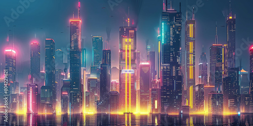 A futuristic cityscape illuminated with neon lights and towering skyscrapers, symbolizing technological progress and urban development