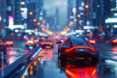 A futuristic cityscape with autonomous vehicles navigating the streets