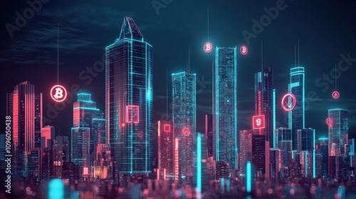 A futuristic cityscape with cryptocurrency symbols integrated into the architecture