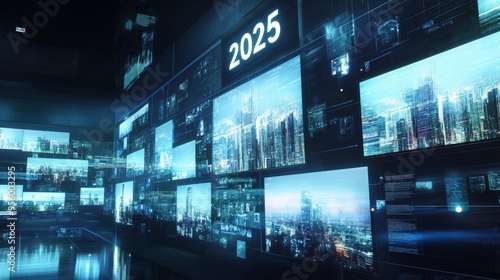 A futuristic cityscape with the year 2025 displayed prominently, symbolizing technological advancement, urban development, data connectivity, and the future of cities.