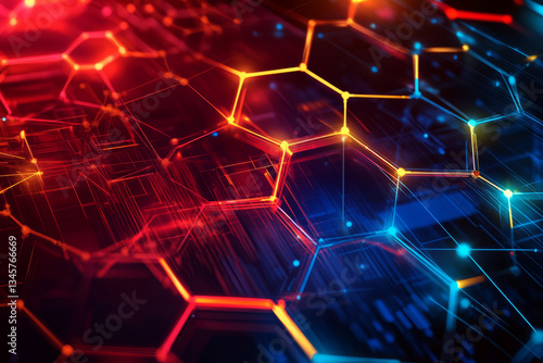 A futuristic, colorful abstract background featuring a network of neon hexagons. The glowing, high-tech shapes in deep red, bright blue, and golden yellow create a sci-fi, cybernetic, and visually