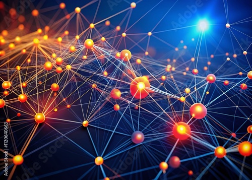 A futuristic computer network features vibrant red and orange dots scattered across a dark blue background, symbolizing connectivity and advanced technology in a digital landscape.